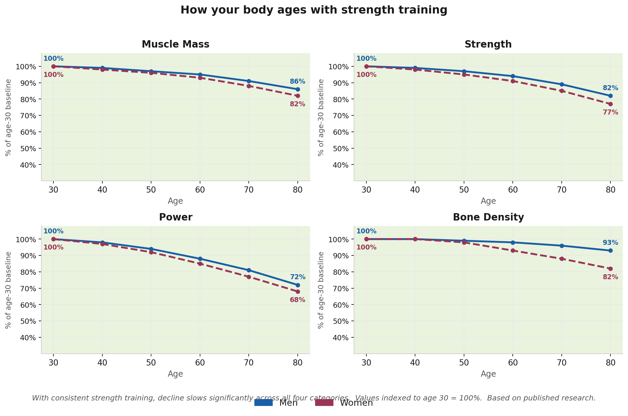 Starting around age 30, the average adult loses 3–8% of muscle mass every decade. Strength drops even faster. That decline affects everything — balance, bone density, metabolism, energy, and your ability to do the things you actually want to do.